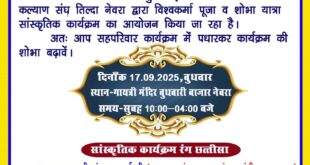 राजस्व मंत्री टंकराम वर्मा होंगे मुख्य अतिथि व गणमान्य नागरिक उपस्थित ख़ोज ख़बर छत्तीसगढ संवाददाता तिल्दा-नेवरा संतोष कुमार यदु तिल्दा-नेवरा। बुधवारी बाजार स्थित गायत्री मंदिर प्रांगण में बने विश्वकर्मा मंदिर परिसर में सिविल ठेकादार कल्याण संघ द्वारा आगामी 17 सितम्बर, दिन बुधवार को विश्वकर्मा पूजा बड़े ही धूमधाम से मनाई …