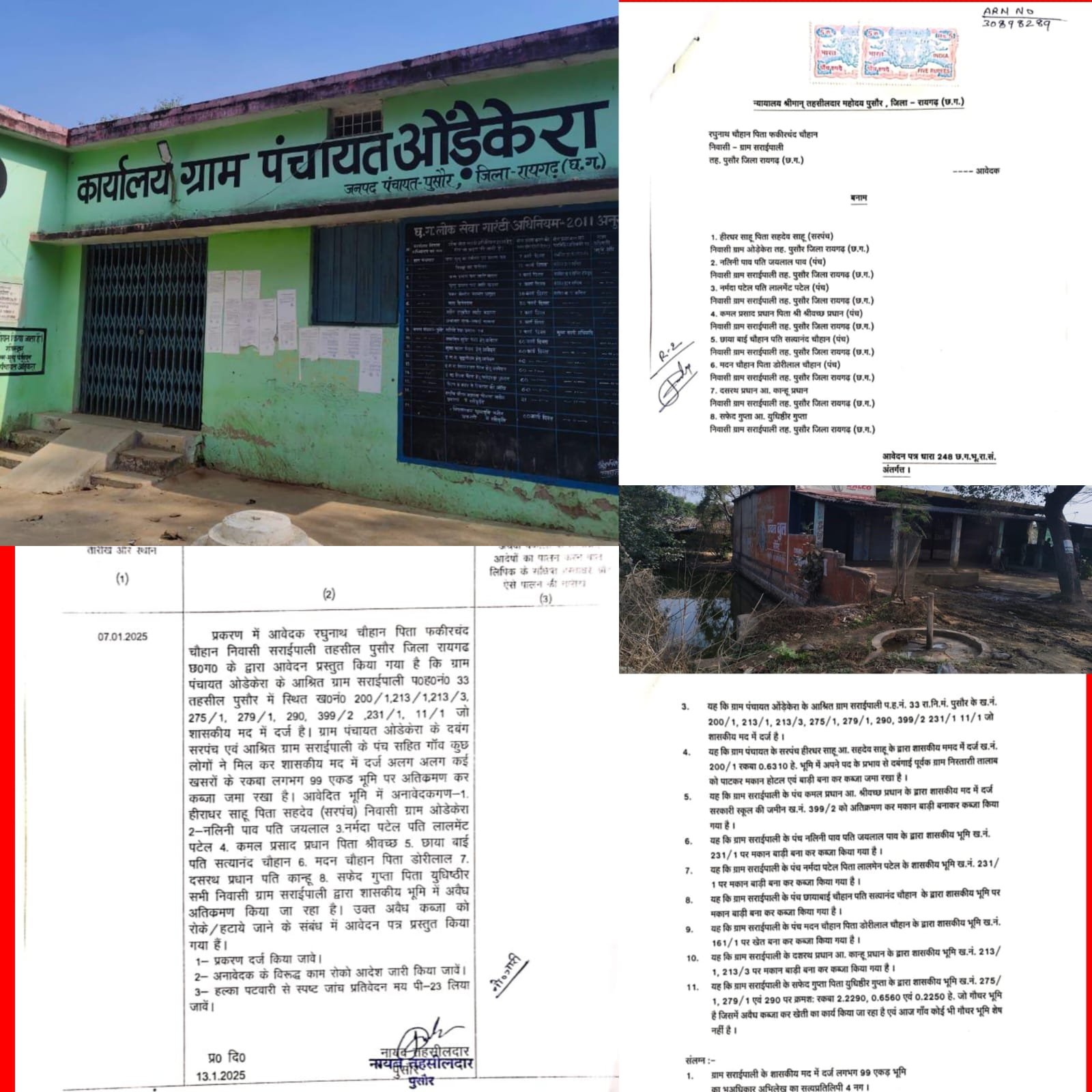 रायगढ़/पुसौर। ग्राम पंचायत ओड़ेकेरा और उसके आश्रित ग्राम सराईपाली में शासकीय भूमि पर बड़े पैमाने पर अवैध कब्जे का मामला सामने आया है। कुल 99 एकड़ शासकीय भूमि पर सरपंच, सचिव और अन्य प्रभावशाली लोगों द्वारा अतिक्रमण के गंभीर आरोप हैं। प्रशासन ने मामले को गंभीरता से लेते हुए जांच शुरू कर दी है।