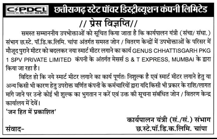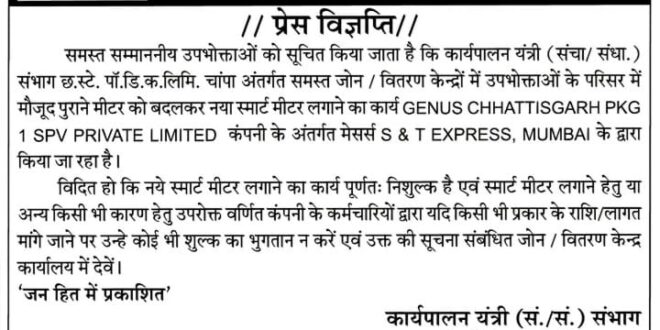 चांपा। विद्युत मंडल क्षेत्र चांपा में राज्य शासन की “माहिती योजना” के तहत स्मार्ट विद्युत मीटर लगाने का कार्य एक बार फिर युद्ध स्तर पर प्रारंभ कर दिया गया है। मिली जानकारी के अनुसार यह कार्य निशुल्क रूप से किया जा रहा है, जिसे विद्युत विभाग द्वारा चयनित ठेका एजेंसी के माध्यम से निष्पादित किया जा रहा है।