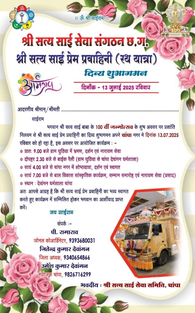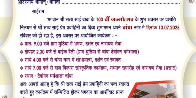 जिला उपमुख्यालय चांपा,,, अत्यंत हर्ष का विषय है कि श्री सत्य साईं जी महाराज के सौ वे जन्म उत्सव दिवस के अति पावन अवसर पर पूरे देश भर में अनेकों सत्य साईं प्रेम प्रवाहिनी रथ यात्रा का आयोजन किया जा रहा है,जिसमें बड़े ही सौभाग्य से छत्तीसगढ़ में भी एक रथ का इन दोनों भ्रमण चल रहा है जो आज जांजगीर चांपा जिला के जिला उप मुख्यालय चांपा में प्रवेश होने के अवसर पर श्री साईं सेवा संगठन चांपा के पदाधिकारी,सदस्य,समर्थन,एवं श्रद्धालु भक्तों के द्वारा बड़े उत्साह पूर्वक धार्मिक कार्यक्रम का आयोजन किया जा रहा है, जिसमें सत्य साईं प्रेम वाहिनी रथ यात्रा का स्वागत आतिशी ढंग से करने के लिए भक्ति एवं समर्थकों तथा पदाधिकारी ने युद्ध स्तर पर तैयारियां प्रारंभ कर दी है, बताया जा रहा है कि आज किसी भी समय सत्य साईं प्रेम प्रवाहिनी रथ यात्रा का प्रवेश चांपा नगर में हो सकता है, जिसे लेकर बड़े ही व्यापक स्तर पर तैयारी की जा रही है,यही नहीं बल्कि आज पूरे दिन भर श्री सत्य साईं सेवा संगठन के तत्वाधान में विभिन्न सांस्कृतिक तथा धार्मिक भजन कीर्तन पूजा पाठ का आयोजन भी संपन्न होगा, तदुपरांत सायं काल चांपा नगर के देवांगन धर्मशाला में विभिन्न कार्यक्रमों के साथ ही महाप्रसाद वितरण का आयोजन भी संपन्न होगा जिसमें बड़ी संख्या में चांपा ही नहीं बल्कि आसपास के अन्य जिलों तथा ग्रामीण क्षेत्र से भक्त जनों के शिरकत करने की संभावना व्यक्त की गई है,बताते चलें कि जांजगीर चांपा जिले के चांपा नगर में श्री साईं सेवा संगठन के अंतर्गत पदाधिकारी सदस्य समर्थकों एवं भक्तों के द्वारा इस कार्यक्रम को सफल बनाने के लिए बड़े उच्च स्तर पर कई दिनों पहले से तैयारी की जा रही है,तथा इस कार्यक्रम को और अधिक सफल बनाने के लिए सेवा संगठन समिति के पदाधिकारी एवं सम्माननीय सदस्यों के द्वारा अधिकाधिक संख्या में उपस्थित होकर कार्यक्रम को सफल बनाने की अपील की गई है,,,।