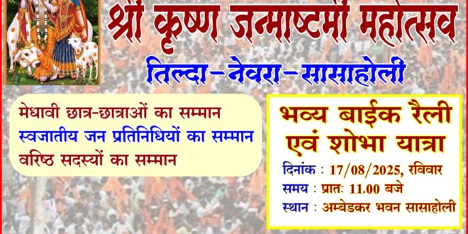 नंदनंदन, यशोदानंदन भगवान श्रीकृष्ण जी की असीम कृपा से विगत वर्षों की भांति इस वर्ष भी युवा यादव महासभा तिल्दा-नेवरा सासाहोली द्वारा भव्य श्रीकृष्ण जन्माष्टमी महोत्सव का आयोजन किया जा रहा है। कार्यक्रम का आयोजन दिनांक 17 अगस्त 2025, दिन रविवार को किया जाएगा।