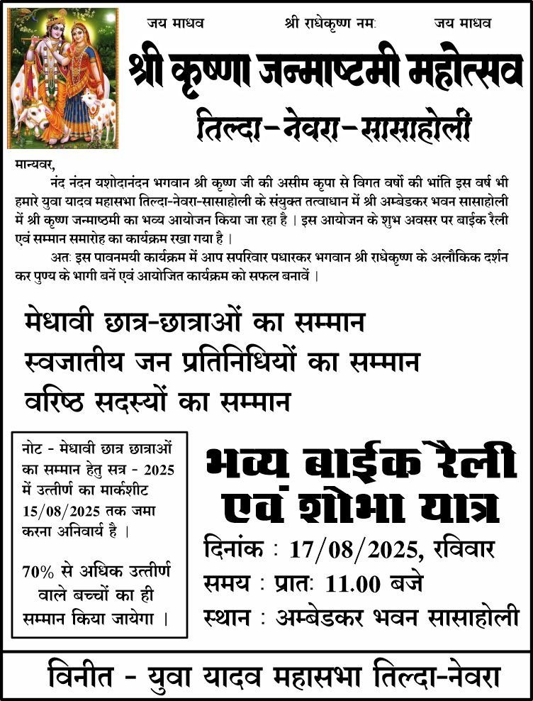 युवा यादव महासभा ने समस्त समाजबंधुओं से आग्रह किया है कि वे इस पावन अवसर पर सम्मिलित होकर कार्यक्रम की शोभा बढ़ाएं और श्रीकृष्ण जन्माष्टमी के आनंद में सहभागी बनें।