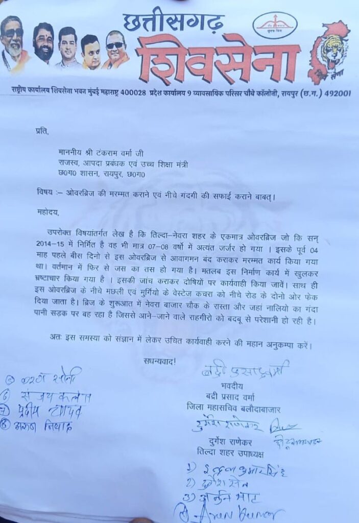 तिल्दा-नेवरा शिव सैनिकों ने भाजपा शासनकाल (2013-14) में निर्मित तिल्दा-नेवरा ओवरब्रिज में भ्रष्टाचार और उसकी बदहाल स्थिति को लेकर रायपुर लोकसभा सांसद ब्रिजमोहन अग्रवाल एवं क्षेत्रीय विधायक व राज्य के कैबिनेट मंत्री टंकराम वर्मा को कार्यक्रम के दौरान ज्ञापन सौंपा।