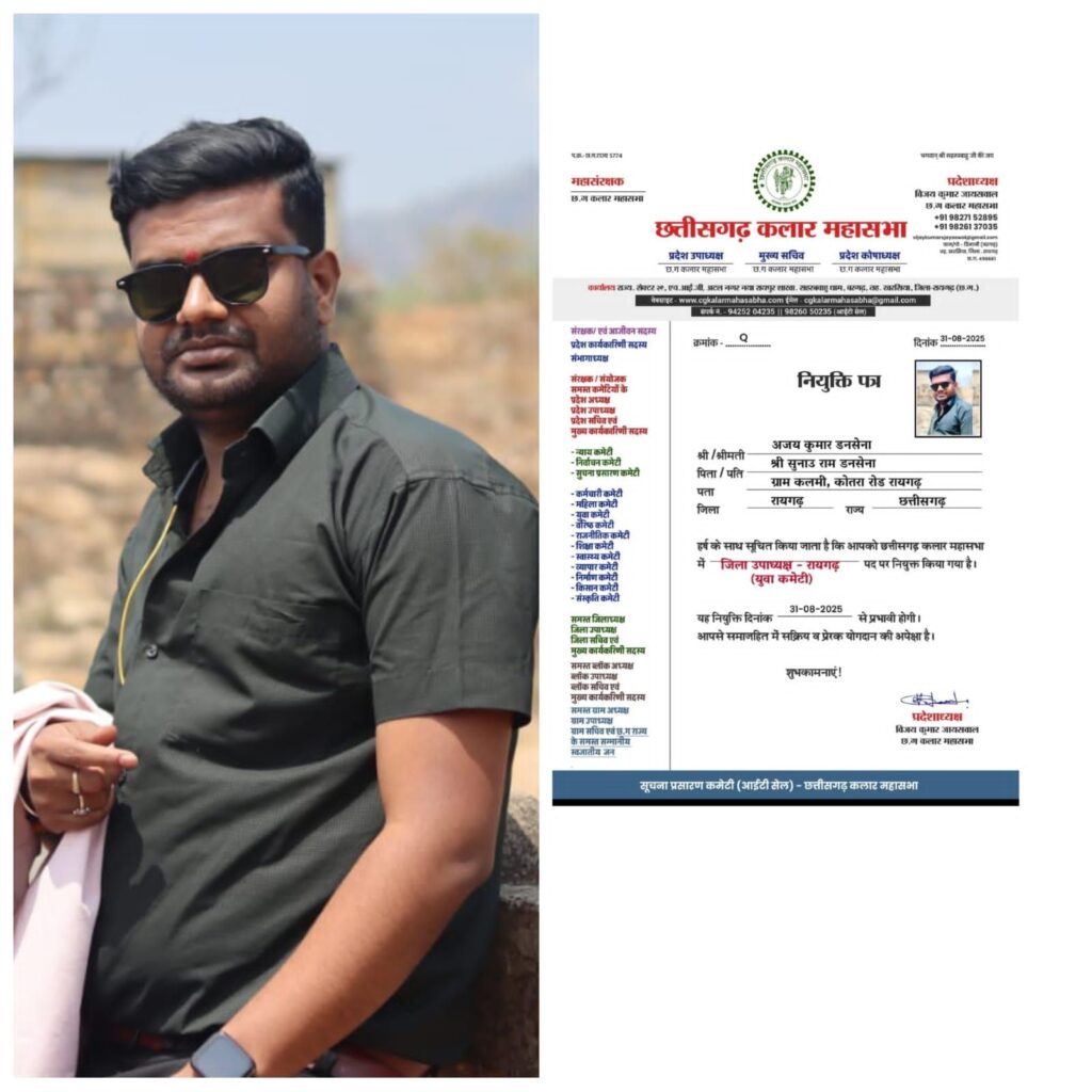 रायगढ़ कलमी निवासी और साथ ही साथ समाज सेवी के रूप में काम करने वाले श्री अजय डनसेना को छ ग कलार महासभा छ ग का युवा कमेटी के जिला उपाध्यक्ष बनाया गया। इनकी नियुक्ति श्री विजय कुमार जायसवाल प्रदेश अध्यक्ष एवं महाध्यक्ष श्रीमति सरोज दुष्यंत डनसेना की अनुशंसा पर की गई है।