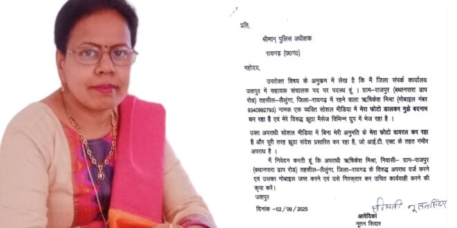 जिला सम्पर्क कार्यालय जशपुर की सहायक संचालक नूतन सिदार एक बार फिर विवादों में घिर गई हैं। इस बार उन्होंने सोशल मीडिया पर फैल रही खबरों और मैसेजों को लेकर पुलिस अधीक्षक रायगढ़ को शिकायत दी है। उन्होंने आरोप लगाया है कि रायगढ़ जिले के एक ग्रामीण युवक ऋषिकेश मिश्र उनकी फोटो और संदेश वायरल कर बदनाम कर रहा है।