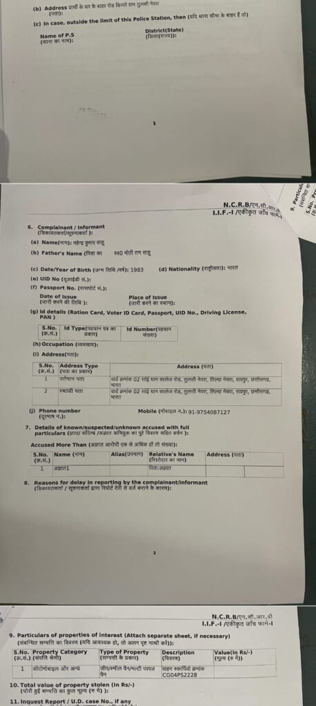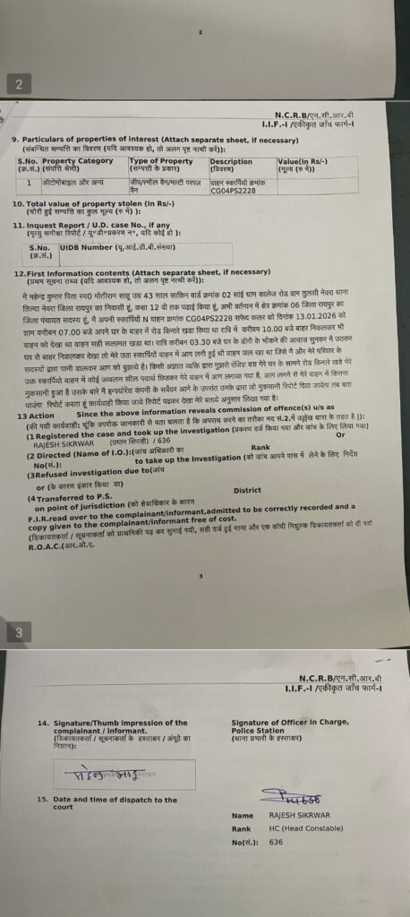प्राप्त जानकारी के अनुसार 13 जनवरी 2026 की शाम करीब 7 बजे वाहन घर के सामने खड़ा किया गया था। रात लगभग 10 बजे तक वाहन सुरक्षित स्थिति में था। लेकिन रात्रि करीब 3:30 बजे कुत्तों के भौंकने की आवाज़ पर बाहर निकलने पर वाहन धधकता हुआ मिला। तत्परता दिखाते हुए श्रीमती साहू एवं परिजनों ने पानी डालकर आग बुझाई, जिससे बड़ा हादसा टल गया।