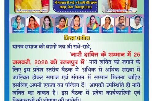 सर्व यादव समाज छत्तीसगढ़ महिला प्रकोष्ठ के तत्वावधान में मां भगवती महामाया सिद्ध शक्ति पीठ की पावन धरा रतनपुर, जिला बिलासपुर में दिनांक 25 जनवरी 2026, रविवार को प्रातः 11:00 बजे से एक भव्य एवं ऐतिहासिक महिला सम्मेलन का आयोजन किया जा रहा है।