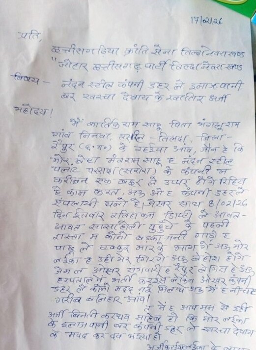 परिवार ने 17/02/2026 को छत्तीसगढ़िया क्रान्ति सेना के पदाधिकारियों से संपर्क कर मदद की गुहार लगाई। इसके बाद संगठन के प्रतिनिधि मौके पर पहुंचे और कंपनी प्रबंधन से सीधी चर्चा की।