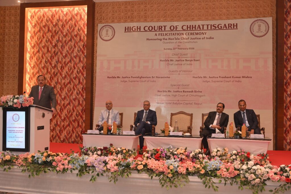 रायपुर/तिल्दा नेवरा। छत्तीसगढ़ की धरती पर देश के न्यायिक इतिहास का अहम क्षण दर्ज हुआ, जब भारत के मुख्य न्यायाधीश सूर्यकांत राजधानी रायपुर पहुंचे। उनके आगमन पर मुख्यमंत्री विष्णु देव साय ने आत्मीय स्वागत करते हुए पुष्पगुच्छ भेंट किया और राजकीय गमछा ओढ़ाकर सम्मानित किया।