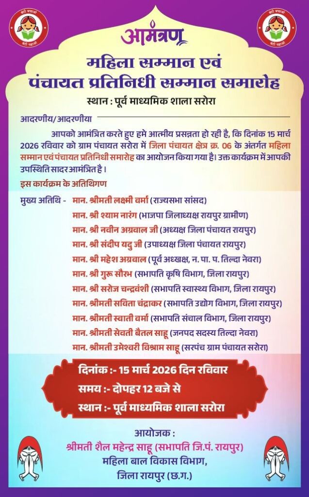 जिला पंचायत क्षेत्र क्रमांक 06 के अंतर्गत ग्राम सरोरा में दिनांक 15 मार्च 2026, रविवार को महिला सम्मान एवं जनप्रतिनिधि सम्मान समारोह का आयोजन किया जा रहा है। इस अवसर पर क्षेत्र के सरपंच, उप-सरपंच, जनपद सदस्य तथा समाज एवं ग्राम विकास में विशेष योगदान देने वाली माताओं और महिलाओं को सम्मानित किया जाएगा।